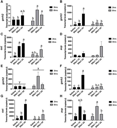 Effects of SNa1–14 and SNa1–34 on reproductive neuropeptide in telencephalon (A–D) and hypothalamus (E–H) in female zebrafish. Telencephalon expression of gnrh2 (A), gnrh3 (B), oxt (C), avp (D), and hypothalamus expression of gnrh2 (E), gnrh3 (F), oxt (G), and avp (H) are presented (mean + SEM; n = 8). In E), the different superscripts (x, y) indicate a significant main effect of time (F = 10.14, P = 0.015). In other panels, means with different letters (a, b) indicate a significant difference (two-way ANOVA; P < 0.05). |
