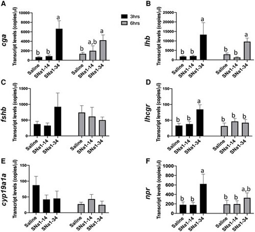 Effects of SNa1–14 and SNa1–34 injection on reproduction-related gene expressions in pituitary (A–C) and ovary (D–F) in female zebrafish. Transcript levels of cga (A), lhb (B), and fshb (C) in pituitary and levels of lhcgr (D), cyp19a1a (E), and npr (F) in ovary are presented (mean + SEM; n = 8). Means with different letters (a, b) indicate a significant difference (two-way ANOVA; P < 0.05). |