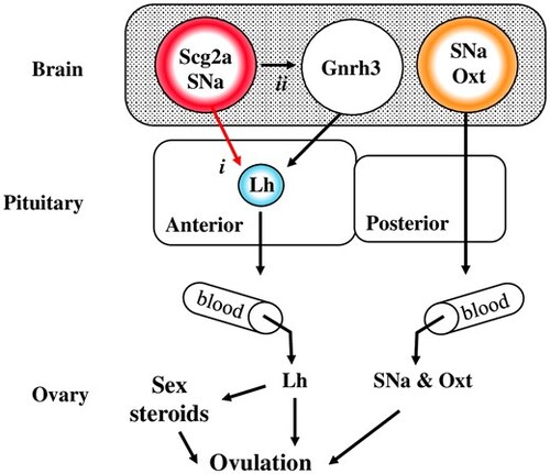 Summary of key findings and working model for the role of SNa1–34 in female zebrafish reproduction. Prohormone convertases selectively process the Scg2a precursor protein to the bioactive peptide SNa1–34. Immunocytochemistry revealed SNa and OXT are colocalized in preoptic neurons. We found that SNa + OXT neurons project to the neurointermediate lobe in the posterior pituitary. While direct evidence is still scant, localization of SNa and OXT in nerve terminals implies release into the circulation, where the peptides may influence ovulation and spawning. Some neuronal fibers immunoreactive for SNa but not OXT entered the proximal pars distalis (anterior pituitary). Regression analysis revealed that SNa1–34 (SNa on the figure) and Gnrh3 peptide levels in the brain increase concomitantly at the time of the Lh surge. In the pituitary, SNa1–34 peptide levels are highest prior to ovulation. Experimental data demonstrated that 3 h following i.p. injection of synthetic SNa1–34 increases mRNA levels for gnrh3 in the hypothalamus, lhb and cga in the pituitary, and lhcgr and npr in the ovary. These are key indicators of activation of genes at each level of the HPG axis that led to ovulation 6 h after a single SNa1–34 injection. SNa1–34 can enhance Lh cell activity through a neuroendocrine pathway (i) and by stimulating Gnrh3 neurons (ii). This model is supported by previous observations in mutant lines (27), where it was demonstrated that hypothalamic gnrh3, and pituitary lhb and cga are lower in scg2a-/- females compared with wild type. In the same mutant line, SNa1–34 injection in the subfertile scg2a-/-; scg2b-/- double mutant zebrafish enhanced spawning by ∼3-fold, like the effects of the Lh analog hCG in the same line (27). |