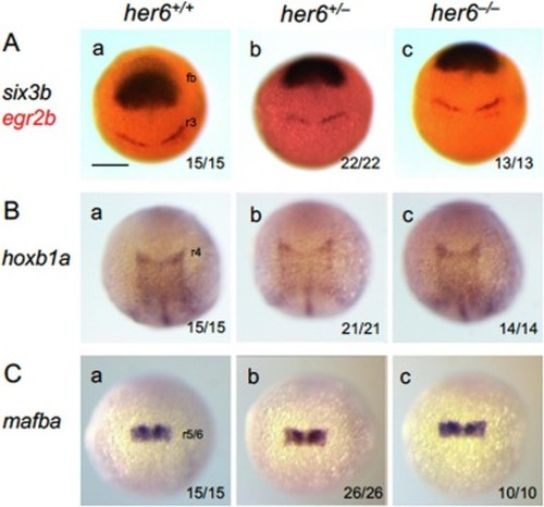 Expression of brain regionalization genes in her6 mutants. Expression patterns of brain regionalization genes (A. six3b in the forebrain and egr2b in the r3 and r5; B. hoxb1a in the r4 and posterior neural plate; C. mafba in the r5 and r6) were assessed at the bud stage in wild-type (+/+), heterozygotes (+/−), and homozygotes (−/−) in terms of her6 mutation. At the bud stage, egr2b had just started to be expressed faintly in r3 alone. Dorsal views with anterior to the top. Numbers of the embryos with the indicated patterns and total scored embryos are shown in the bottom-right. See the legend to Fig. 1 for abbreviations. Scale bar, 200 μm. EXPRESSION / LABELING: