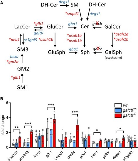 Expression of enzymes involved in LacCer/cer metabolism in the brain of galcb knockout zebrafish. (A) Schematic representation of major metabolic pathways involved in LacCer/Cer metabolism. (B) The expression of the indicated genes has been assessed by RT-qPCR in the brain of wild-type (WT) and galcb knockout (KO) mutants at 4 months post fertilization. For each gene, the data were normalized to its expression in one WT animal. Data are the mean ± standard deviation of 4–6 animals per group. One-way ANOVA (Tukey's multiple comparison test): *P < 0.05, **P < 0.01, ***P < 0.001. In A, enzymes exhibiting upregulated gene expression in brains of galcb KO animals are marked by asterisks. LacCer = lactosylceramide; RT-qPCR = reverse transcriptase-quantitative PCR. |