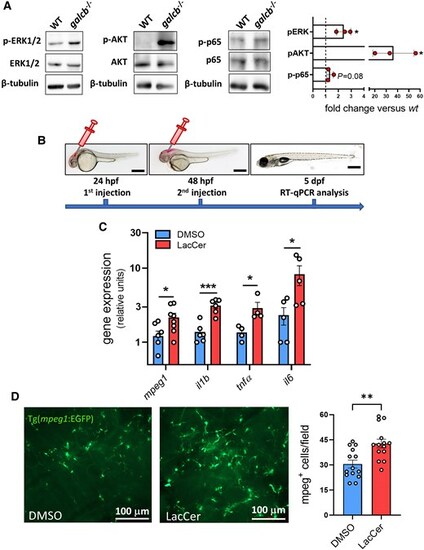 LacCer induces a proinflammatory phenotype in zebrafish brain. (A) Western blot analysis of ERK1/2, AKT and p65 phosphorylation in the brain of wild-type (WT) and galcb knockout (KO) zebrafish showing the activation of signalling pathways associated to LacCer accumulation in galcb KO zebrafish at 4 months post fertilization. Right: Quantification of immunoreactive bands obtained in three independent experiments. (B) Schematic of the experimental procedure for intraventricular injection of GalCer in zebrafish embryos. (C) RT-qPCR analysis of the expression levels of the inflammatory markers interleukin-1b (il1b), tumor necrosis factor-a (tnfa), il6 and macrophage expressed 1 (mpeg1) following a double intraventricular injection of 0.4 ng of LacCer in the brain of WT zebrafish embryos. For each gene, the data were normalized to its expression in one dimethyl sulfoxide (DMSO)-injected animal. Data are the mean ± standard error of the mean of 4–6 pools of 7 embryos per group. Scale bars: 500 μm. Student's t-test: *P < 0.05, **P < 0.01. (D) Fluorescent microscopic analysis following double injection of 0.4 ng DMSO or LacCer in the brain ventriculus of Tg(mpeg1:EGFP) zebrafish embryos shows a significant infiltration of mpeg1-positive macrophages in LacCer injected brains. Right: Quantification of mpeg1-positive cells in harvested brains. Data are the mean ± standard error of the mean of ≥3 microscopic fields per animals (n = 4). Scale bars: 100 μm. Student's t-test: **P < 0.01. LacCer = lactosylceramide; RT-qPCR = reverse transcriptase-quantitative PCR. |