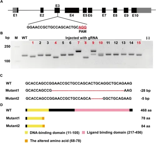 Construction of zebrafish roraa−/− mutant lines via the CRISPR/Cas9 technique. A Schematic diagram of the roraa exons and target site design. The black boxes represent exons, and the gray boxes represent UTR sequences. The gRNA was designed for the third exon, with the red area indicating the PAM site. B Evaluation of mutation efficiency in embryos after gRNA injection. Twenty-four hours postinjection, the injected embryos were compared with noninjected WT embryos for activity assessment, followed by TA cloning and random selection of colonies for PCR. The results from the 4% agarose gel electrophoresis clearly differed between the experimental group colonies and the WT group (with the corresponding colony numbers marked in red). C Comparison of DNA sequencing results between the WT and mutant strains. The mutation types in the mutants included − 28 bp and − 5 bp. D Comparison of amino acid sequences between the WT and mutant strains. The base deletion led to a frameshift mutation and an early stop codon, resulting in a truncated protein, with the mutant losing part of the DNA-binding domain and the entire ligand-binding domain |
