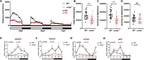 Behavioral rhythms and gene expression changes in roraa−/− and WT zebrafish under LD conditions. A Activity curves for WT and roraa−/− plants under LD (14 h/300 lx: 10 h/30 lx) conditions. B Total activity of zebrafish, showing that compared with WT zebrafish, roraa−/− zebrafish had significantly lower activity during the day. C Average activity of zebrafish under light conditions, where roraa−/− zebrafish presented significantly lower activity during the day than did WT zebrafish. D Average activity of zebrafish under dark conditions, with no significant difference between roraa−/− and WT zebrafish. E–H Expression levels of the clock genes bmal1b, clock1a, cry1aa, and per2. The black curve represents activity changes in WT, whereas the red curve represents activity changes in roraa−/−; the method for difference analysis was Student's t test, where ns indicates p > 0.05 and *** indicates p < 0.001 |