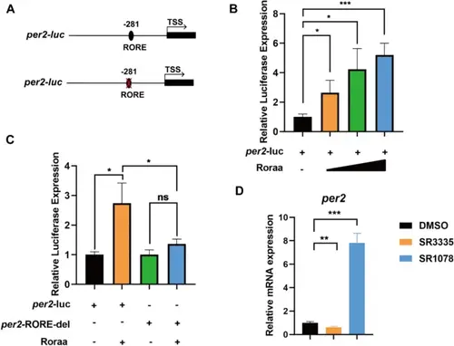 Transcriptional regulation of the clock gene per2 by Roraa in zebrafish. A Analysis of the cloned promoter sequence elements on the per2-luc plasmid, with a sequence length of 595 bp that includes one RORE element. A schematic diagram showing the deletion of the RORE in the per2 promoter sequence. B The gradient activation effect of Roraa on per2 expression, with activation increasing with increasing concentrations of Roraa at 100 ng, 200 ng, and 400 ng. C The activation effect of Roraa on per2 disappeared after the deletion of the RORE element, indicating the key role of the RORE element in Roraa's regulation of per2 expression. D Comparison of the relative expression levels of per2 in zebrafish treated with SR3335 and SR1078. “ + ” indicates cells transfected with the specific plasmid, whereas “-” indicates the control group without plasmid transfection. The method for difference analysis was Student's t test; ns indicates p > 0.05, * indicates p < 0.05, and *** indicates p < 0.001 |