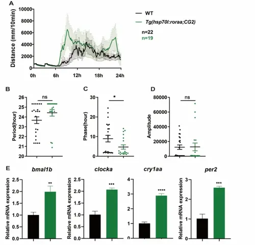 Whole-body overexpression of roraa disrupts the behavioral rhythms of zebrafish. A Activity change curves for WT and Tg(hsp70 l;CG2) after heat shock at 37 °C. B–D Analysis results of the period, phase, and amplitude. The R package MetaCycle was used for rhythmic analysis of the behavior data, and there were no significant differences in the activity period between WT and roraa−/−; however, the activity phase of roraa−/− zebrafish was advanced by approximately 5 h, and the activity amplitude was significantly lower than that of WT zebrafish. E Changes in the expression of the core clock genes bmal1b, clock1a, cry1aa, and per2 in WT and Tg(hsp70 l;CG2) after heat shock at 37 °C. The black curve represents activity changes in WT, whereas the green curve represents activity changes in Tg(hsp70 l;CG2). The method for difference analysis was Student's t test; ns indicates p > 0.05, * indicates p < 0.05 |