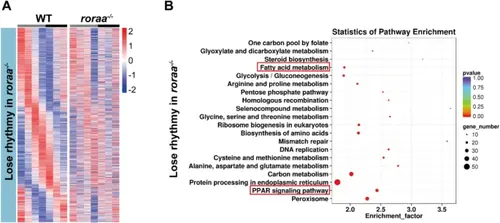 Changes in rhythmic genes and potentially affected signaling pathways after roraa gene mutation, as revealed by transcriptome sequencing. A Clustering analysis of genes whose rhythmic expression was lost in the roraa−/− mutants compared with the WT. B KEGG pathway enrichment analysis of genes whose rhythmic expression was lost in roraa−/− mutants compared with WT. The results revealed significant enrichment of fatty acid metabolism and PPAR signaling pathways |