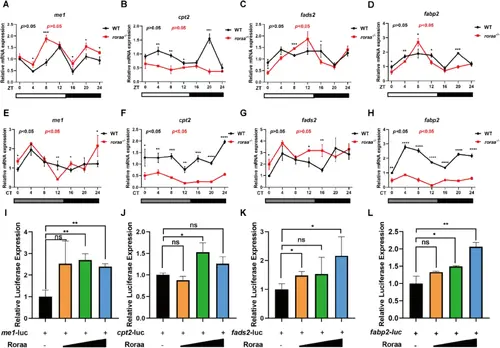 Roraa directly regulates core genes of the PPAR signaling pathway, influencing PPAR signaling activity. A–D Validation of changes in the expression of me1, cpt2, fads2, and fabp2 in WT and roraa mutants under LD conditions via real-time quantitative PCR. E–H Validation of changes in the expression of me1, cpt2, fads2, and fabp2 iin WT and roraa mutants under DD conditions via real-time quantitative PCR. The JTK cycle was used to determine whether gene expression was rhythmic, and differences in expression levels between the WT and mutant strains were analyzed at each time point. I–L Dual-luciferase reporter assays were used to detect the regulatory effects of Roraa on the activation of the me1, cpt2, fads2, and fabp2 promoters. Red represents mutants, whereas black represents WT; p values indicate results from JTK cycle rhythmicity analysis, with p < 0.05 indicating rhythmicity and p > 0.05 indicating a lack of rhythmicity. The method for difference analysis was Student's t test |