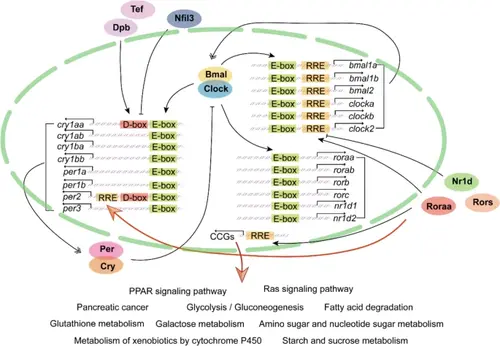 Model illustrating the regulatory role of Roraa in circadian rhythms and metabolism. This diagram depicts the interactions between the core circadian clock components (Bmal1 and Clock) and various downstream genes, including roraa, as well as their influence on metabolic pathways. Key regulatory elements, such as E-boxes, D-boxes, and ROREs, are highlighted, indicating their involvement in the transcriptional regulation of target genes. Roraa has been shown to directly influence the expression of per2 via the RORE, linking circadian control to metabolic processes. Additionally, the pathways affected by Roraa, including the PPAR signaling pathway and Ras signaling pathway, are illustrated, emphasizing its role in lipid metabolism and overall metabolic homeostasis |