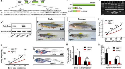 Generation and characterization of cgα-deficient zebrafish using TALENs A: Schematic of TALEN-mediated editing at exon 1 of the cgα locus. Underlined sequences denote the two targeting arms of TALENs. B: Diagram of WT and two truncated mutant Cgα proteins in zebrafish. Green regions represent amino acid sequences identical to WT, while orange regions indicate mismatched residues. C: Heteroduplex-based genotyping of cgα in cgα+/+ control fish (Lanes 1 and 2) and cgα+/− fish (Lanes 3 and 4 for mutant line 1; Lanes 5 and 6 for mutant line 2), amplified products from tail gDNA samples. D: Western blot analysis of Cgα in pituitary samples from control and mutant lines of cgα-deficient male zebrafish. E–H: Gross appearance of control siblings (E, control male; F, control female) and cgα-deficient fish (G, mutant male; H, mutant female) at 4 mpf. I, J: Body length (I) and weight (J) of control siblings and cgα-deficient fish from juvenile to adult stages. K, L: Gross appearance of control sibling (K) and cgα-deficient fish (L) at 16 dpf. Red arrow indicates inflated anterior swim bladder of control fish, white arrow indicates undeveloped anterior swim bladder of cgα-deficient fish. M, N: Levels of triiodothyronine (T3, M) and thyroxine (T4, N) in bodies of control and cgα-deficient fish at 13 and 21 dpf stages. ns: Not significant; *: P<0.05; **: P<0.01; ****: P<0.0001. |