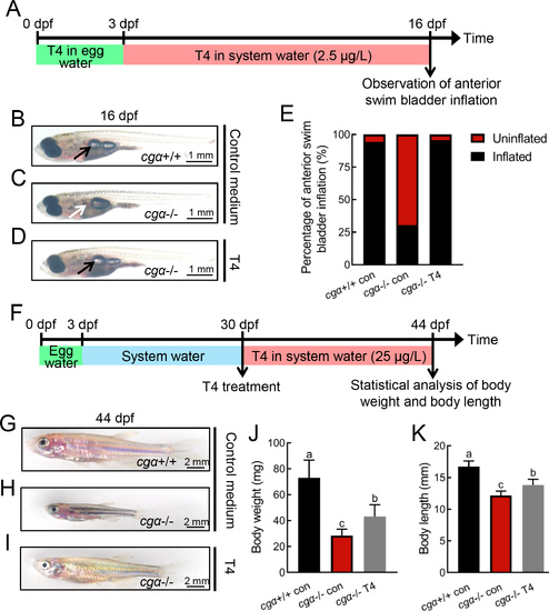 Defective swim bladder inflation and retarded growth of cgα-deficient fish rescued by exogenous thyroxine (T4) supplement A: Schematic of rearing timeline and early T4 administration treatment. Fertilized eggs were reared in egg water containing T4 from 0 to 3 dpf, and in system water containing T4 from 4 to 16 dpf. B–D: Gross appearance of fish at 16 dpf, including control (B), cgα-deficient (C), and cgα-deficient fish administered T4 (D). Black arrow indicates inflated anterior swim bladder of control (B) and cgα-deficient fish administered T4 (D), white arrow indicates undeveloped anterior swim bladder of cgα-deficient fish (C). E: Ratio of anterior swim bladder inflation in control, cgα-deficient, and cgα-deficient fish administered T4 at 16 dpf. F: Schematic of rearing timeline and late T4 administration treatment. Fish were reared in system water containing T4 from 30 to 44 dpf. G–I: Gross appearance of fish at 44 dpf, including control fingerlings (G), cgα-deficient fingerlings (H), and cgα-deficient fingerlings administered T4 (I). J, K: Body weight (J) and length (K) of control, cgα-deficient, and cgα-deficient fingerlings administered T4 at 44 dpf. dpf, days post-fertilization; T4, thyroxine. Different letters in bar chart represent significant differences. |