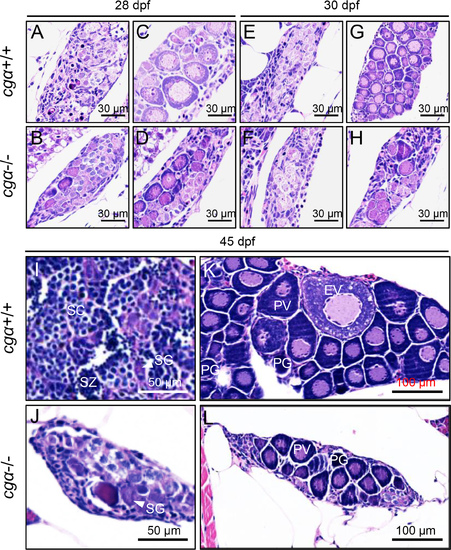 Histological analysis of gonadal development in control and cgα-deficient fish during key stages of sex differentiation A–H: No obvious gonadal differences were observed between control and cgα-deficient fish at 28 and 30 dpf. I, J: At 45 dpf, testes from cgα-deficient males were visibly smaller than those of control males, with germ cells predominantly at the spermatogonia stage. K, L: At 45 dpf, ovaries of cgα-deficient females were smaller than those of control females and contained only PV and PG oocytes. dpf, days post-fertilization; SG, spermatogonia; SC, spermatocytes; SZ, spermatozoa; PG, primary growth follicle; PV, previtellogenic follicle; EV, early vitellogenic follicle. |