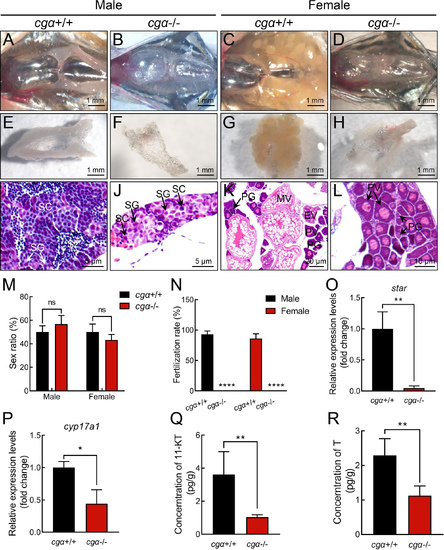 Gonadal hypoplasia in cgα-deficient zebrafish at 4 mpf A–D: Anatomical examination of gonads from control siblings (A, male; C, female) and cgα-deficient fish (B, male; D, female) at 4 mpf. E–H: Dissected gonadal tissues of control siblings (E, male; G, female) and cgα-deficient fish (F, male; H, female) at 4 mpf. I–L: Histological analysis of gonadal tissues from control siblings (I, male; K, female) and cgα-deficient (J, male; L, female) fish at 4 mpf. M: Sex ratio of control siblings and cgα-deficient fish at 4 mpf (n=20). N: Fertilization ratio of control siblings and cgα-deficient fish at 4 mpf when paired with WT fish of the opposite sex (n=8/group). O, P: Expression levels of star (O) and cyp17a1 (P) in testis tissue of control siblings and cgα-deficient fish at 4 mpf. Q, R: Levels of 11-KT (Q) and testosterone (R) from whole-body lysates of cgα-deficient male fish and control male siblings at 4 mpf. SG, spermatogonia; SC, spermatocytes; SZ, spermatozoa; PG, primary growth follicle; PV, previtellogenic follicle; EV, early vitellogenic follicle; MV, middle vitellogenic follicle; 11-KT, 11-ketotestosterone; T, testosterone. ns: Not significant; *: P<0.05; **: P<0.01; ****: P<0.0001. |