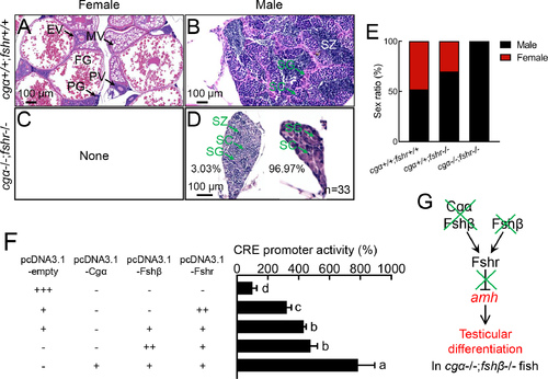 Functional analysis of Fsh signaling function in ovarian differentiation in zebrafish A–D: No ovarian differentiation was observed in cgα−/−;fshr−/− fish at 4 mpf. E: Sex ratio of cgα+/+;fshr+/+ control, fshr−/−, and cgα−/−;fshr−/− fish at 4 mpf. F: cAMP-responsive CRE-luciferase reporter assay in CHO cells transfected with zebrafish Fshr, Fshβ/Fshr, or Cgα/Fshβ/Fshr constructs demonstrated both ligand-independent (constitutive) activity of Fshr and enhanced signaling via Fshβ, with further amplification upon Cgα co-expression. G: Proposed working model of Fsh signaling in ovarian differentiation. SG, spermatogonia; SC, spermatocytes; SZ, spermatozoa; PG, primary growth follicle; PV, previtellogenic follicle; EV, early vitellogenic follicle; MV, middle vitellogenic follicle; FG, full-grown follicle. Letters in bar charts represent significant differences. Green crosses denote gene knockout or inactivation, red letters indicate up-regulation or male-biased sex ratio. CRE, cAMP response element. |