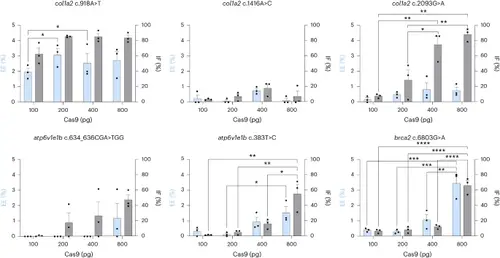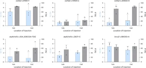 Comparison of EE and IF obtained for each target by microinjection of Alt-R HDR components into the cell or the yolk.Zebrafish embryos at the one-cell stage were injected with 200 pg (col1a2 c.918A>T), 400 pg (col1a2 c.1416A>C, col1a2 c.2093G>A) or 800 pg (atp6v1e1b c.634_636CGA>TGG, atp6v1e1b c.383T>C, brca2 c.6803G>A) Cas9 into the cell or the yolk. Left-hand y axes show EE (blue) and right-hand y axes show IF (gray). Bars and error bars represent the mean + s.e.m. of three biologically independent replicates (n = 3), where each replicate represents a pool of 20–30 injected embryos. Unpaired t-test. |