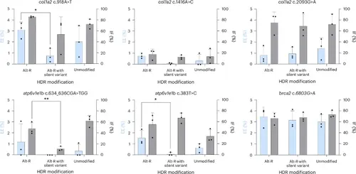 Comparison of EE and IF obtained for each target by microinjection of Alt-R HDR templates, Alt-R HDR templates with silent guide-blocking variants or unmodified HDR templates.Zebrafish embryos at the one-cell stage were injected with 200 pg (col1a2 c.918A>T), 400 pg (col1a2 c.1416A>C, col1a2 c.2093G>A) or 800 pg (atp6v1e1b c.634_636CGA>TGG, atp6v1e1b c.383T>C, brca2 c.6803G>A) Cas9 into the yolk. Left-hand y axes show EE (blue) and right-hand y axes show IF (gray). The bars and error bars represent the mean + s.e.m. of three biologically independent replicates (n = 3), where each replicate represents a pool of 20–30 injected embryos. Dunnett’s multiple-comparisons test: *P < 0.05, **P < 0.01. |