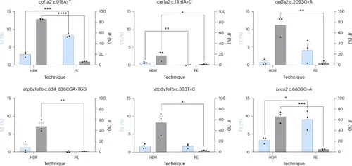 IF at top three predicted off-target locations. IF was determined for Alt-R HDR components with 200 pg (col1a2 c.918A>T), 400 pg (col1a2 c.1416A>C, col1a2 c.2093G>A) or 800 pg (atp6v1e1b c.634_636CGA>TGG, atp6v1e1b c.383T>C, brca2 c.6803G>A) Cas9 or PE components (RNP mixture containing 480 ng/µL pegRNA and 1,380 ng/µL PE2-His protein) injected into the yolk of one-cell-stage zebrafish embryos. The bars and error bars represent the mean + s.e.m. of three biologically independent replicates (n = 3), where each replicate represents a pool of 20–30 injected embryos. Unpaired two-tailed t-test: **P < 0.01, ***P < 0.001. |