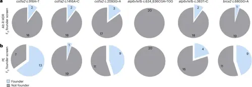 F0 founder screen of 20 potential adult founder zebrafish generated by microinjection of HDR or PE components into the yolk of one-cell-stage zebrafish embryos. a, Results for zebrafish injected with Alt-R HDR components with 200 pg (col1a2 c.918A>T), 400 pg (col1a2 c.1416A>C, col1a2 c.2093G>A) or 800 pg (atp6v1e1b c.634_636CGA>TGG, atp6v1e1b c.383T>C, brca2 c.6803G>A) Cas9. b, Results for zebrafish injected with PE components (RNP mixture containing 480 ng/µL pegRNA and 1,380 ng/µL PE2-His protein). |