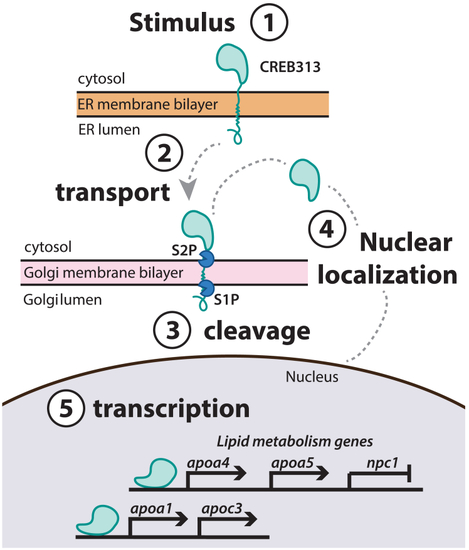 Process of CREB3L3 nuclear localization. 1: In the inactive state, CREB3L3 is anchored to the membrane of the endoplasmic reticulum (ER). 2: An unknown signal induces the release of the tethered protein from the ER membrane, and CREB3L3 is transported to the Golgi. 3: Proteases (S1P, S2P) cleave the transmembrane domain of the protein in the Golgi. 4: Upon cleavage, the DNA-binding domain of the protein can be trafficked to the nucleus. 5: CREB3L3 regulates expression of key lipid metabolism and apoprotein genes by binding to promoter regions and altering transcriptional processes in the nucleus. CREB3L3, cAMP-responsive element-binding protein 3–like 3. |
