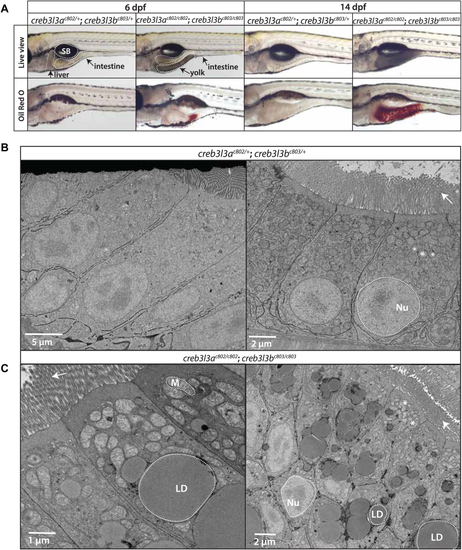 Summary of results and hypothetical model. Creb3l3 signaling activates Creb3l3-responsive genes such as ApoC2, ApoE, and ApoA4. We found that loss of Creb3l3 results in an increase of cytoplasmic lipid droplets in the enterocytes likely due to the loss of ApoA4. It is speculated that ApoA4 is responsible for expanding the size of the ApoB-lp through the addition of triglyceride potentially in poorly understood post ER steps. If enterocytes are unable to enlarge particles, the enterocyte may be directing excess lipid to cytoplasmic lipid droplets for storage. In circulation, ApoE facilitates the uptake of B-lp by peripheral tissues. In our study, we hypothesize that the increase of ApoB-lp half-life, or decrease of ApoB-lp turnover, is a direct result of the loss of ApoE from the ApoB-lp particle. ApoB-lp, apolipoprotein-B–containing lipoprotein; B-lp, ApoB-containing lipoprotein; Creb3l3, cAMP-responsive element-binding protein 3–like 3; ER, endoplasmic reticulum; LDL-r and LRP1, members low-density lipoprotein receptor family; LPL, lipoprotein lipase; MTP, microsomal triglyceride transfer protein; TG, triglyceride. |