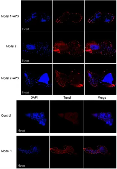 Effects of APS on the cardiomyocytes apoptosis of zebrafish in model groups. TUNEL staining of zebrafish hearts showing the apoptotic cells (red indicates apoptotic cells and blue indicates nuclei) |