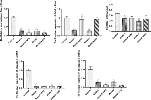 Comparison of mRNA expression of Bax, Bcl-2, caspase-3 and caspase-9 of DCM zebrafish treated with APS. Data are presented as mean ± SD. n = 30. △P < 0.01, Compared with control; □P < 0.01, compared with model 1; ☆P < 0.01, compared with model 2; ★P < 0.05,compared with model 2 |