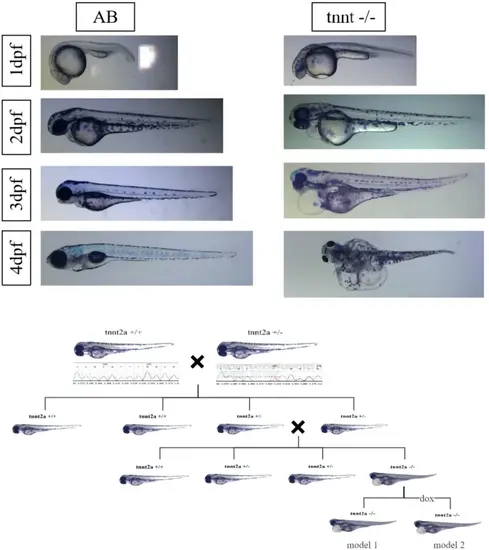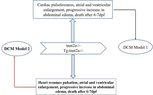 Acquisition and phenotypic analysis of tnnt2a−/− zebrafish. A Model 1 is the tnnt2a−/− homozygous juveniles produced by self-crossing of tnnt2a heterozygotes. Nevertheless, the homozygous mutant model used in this study has only a 25% probability of being obtained through self-crossing, and it exhibits a high mortality rate. To address these limitations, we employed the Tg:Tnnt2a−/− transgenic zebrafish model (referred to as Model 2) in our study. This model features a recovered heartbeat after the addition of DOX, allowing for more reliable and sustainable experimental conditions. B Representative images of lateral view of AB and tnnt2a−/− zebrafish. At 2 dpf, the tnnt2aex10Δ2 ( tnnt2a−/−) exhibits a phenotype reminiscent of dilated cardiomyopathy, characterized by cardiac arrest and enlargement of both the atrium and ventricle. Concurrently, mutant zebrafish display significant pericardial effusion, a hallmark of heart failure, at approximately 3 dpf |