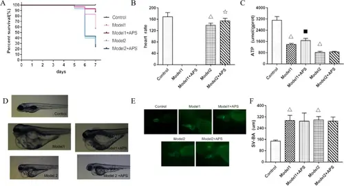 APS improves the cardiac function of DCM zebrafish. A The survival rates of zebrafish in each group, n = 30. B The heart rate of zebrafish after APS administration. Data are mean ± SD ( n = 10; △P < 0.01, compared with control; ☆P < 0.01, compared with the model 2). C Effects of APS on the ATP of zebrafish in model groups. ( n = 10; △P < 0.01, compared with control; ■P < 0.05, compared with model 1). D Representative images of zebrafish in each group at 4dpf. E–F. Comparison of SV-BA of zebrafish in model groups and after APS treatment. Data are mean ± SD ( n = 8; △P < 0.01, compared with control). The experiment was repeated three times |
