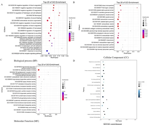 Bioconductor database-enriched pathways and GO entries. A GO enrichment entries in the top 20 about the biological process (BP). B GO enrichment entries in the top 20 about cellular component (CC). C GO enrichment entries in the top 20 about molecular function (MF). D KEGG enrichment entries in the top 20 (p < 0.05). The color of the bubble represents the value of p, and the size of the bubble represents the count of relative entries |