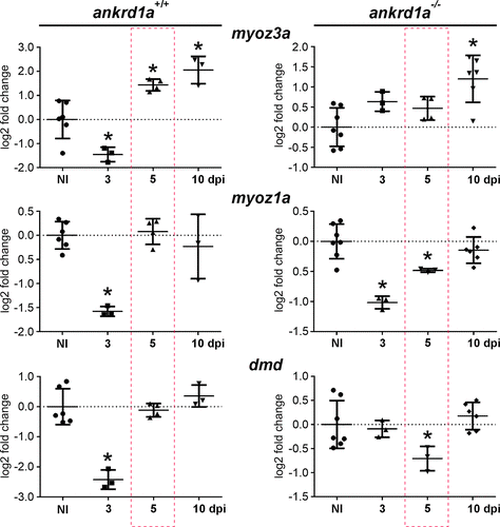 The expression of maturation markers myoz3a, myoz1a, and dmd is affected in ankrd1a mutant zebrafish during injury repair. qPCR was performed using RNA isolated from noninjured (NI) and injured muscle of both genotypes [wild-type (wt) and ankrd1a mutant] at 3, 5, and 10 days postinjury (dpi) (minimum 3 zebrafish for each timepoint). Red dashed rectangles emphasize results obtained at 5 dpi for easier comparison. Results are presented as log2 fold change ± SD. Statistical analysis was performed using the one-way ANOVA with Dunnett’s post hoc test. The exact P values are given in Supplemental Table S8. Average Ct values ± SD are listed in Supplemental Table S4. *P ≤ 0.05. |