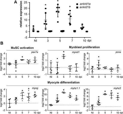 Upregulation of endogenous ankrd1a expression in injured adult zebrafish skeletal muscle correlates with the expression of genes activated during several phases of skeletal muscle repair. mRNA levels of ankrd1a and ankrd1b (A) and representative marker genes involved in the activation of satellite cells (pax7a), myoblast proliferation (myod1 and pcna), and myocyte differentiation [myogenin (myog) and myosin heavy chain isoforms 1.1 (myhz1.1) and 2 (myhz2)] (B) were assessed at 3, 5, 7, and 10 days postinjury (dpi) by RT-qPCR. At least 3 zebrafish were used per experimental group. RNA isolated from the skeletal muscle of noninjured zebrafish served as a control (NI). The data for A are presented as fold change ± SD, normalized to the ankrd1a expression level in noninjured control. The data on B are presented as mean log2 fold change ± SD. The exact P values are given in Supplemental Table S8. Average Ct values ± SD are listed in Supplemental Table S3. MuSC, muscle satellite cells. *P ≤ 0.05. |