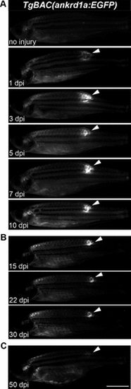 Expression of TgBAC(ankrd1a:EGFP) in injured skeletal muscle of adult zebrafish. А: three zebrafish per each timepoint were injured and left to recover for 1, 3, 5, 7, and 10 days before imaging. B: for longer timepoints, 3 zebrafish were injured. At 15 and 22 days postinjury (dpi), they were anaesthetized, imaged, and returned to the system water. At 30 dpi, they were euthanized, images were acquired, and tissue around the injury was used for RNA isolation. C: three zebrafish were injured, left to recover for 50 days, and imaged. Images of one representative zebrafish per experiment are shown. White arrowheads point to the fluorescence signal at the site of injury. The images on the same panel were acquired under the same conditions. Scale bar, 5 mm. EGFP, enhanced green fluorescent protein. |