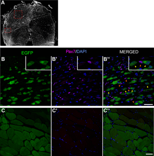 TgBAC(ankrd1a:EGFP) expression was not detected in activated satellite-like cells found within the injury area. Cryosections of injured skeletal muscle at 4 days postinjury (dpi) (n = 3) were immunostained with anti-Pax7 antibody, and nuclei were labeled with DAPI. A: low magnification image of the representative muscle section stained with DAPI, with delineated injury region (white dashed line) and positions of higher magnification images in injured (B–B″) and uninjured (C–C″) regions. Orange arrowheads on B″ point to some of the Pax7-positive nuclei as examples. Yellow arrowheads point to Pax7-negative myoblasts with visible nuclei. No Pax7-positive nuclei were detected in the adjacent uninjured region. Scale bars, 25 μm for B–B″ and 50 μm for C–C″. EGFP, enhanced green fluorescent protein. |