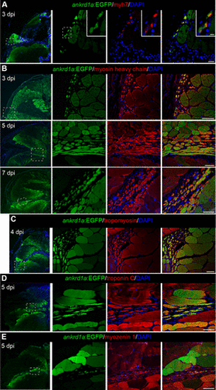 Newly forming myofibers express TgBAC(ankrd1a:EGFP). Cryosections of injured skeletal muscle of the reporter line TgBAC(ankrd1a:EGFP) (n = 3), at indicated timepoints, were stained for muscle markers: embryonic myosin Myh7 (A), myosin (B), tropomyosin (C), troponin C (D), and myozenin 1 (E). Nuclei were stained with DAPI. Low-magnification images are on the left with marked positions (dashed boxes) of higher-magnification images on the right. Elongated myofibers inside the injury area on B and D correspond to longitudinally cut fibers. Scale bars, 20 μm for A, 5 μm for insets in A, and 50 μm for B–E, for higher magnification images on the right. EGFP, enhanced green fluorescent protein. |