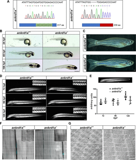 Characterization of ankrd1a mutant zebrafish. A: DNA sequences, electropherogram of ankrd1a+/+ and ankrd1a−/− alleles, and schematic representation of wild-type (wt) and mutant Ankrd1a protein structure. Hyphens indicate deleted bases, and ANK is ankyrin repeat. B: lateral view of wt (ankrd1a+/+) and ankrd1a mutant (ankrd1a−/−) embryos and larvae imaged at designated time points. Scale bar, 0.5 mm. C: appearance of adult ankrd1a+/+ and ankrd1a−/− zebrafish. Scale bar, 1 mm. D: birefringence analysis of ankrd1a−/− and ankrd1a+/+ somites at designated timepoints. Representative images are shown, n = 10 larvae per each timepoint and genotype. Lateral views, anterior to the left. Scale bar, 200 μm. E: birefringence quantification was performed within the outlined area and expressed as pixel intensities (gray values). No significant difference in muscle integrity between ankrd1a−/− and ankrd1a+/+ was observed (P > 0.05). F: Phalloidin staining of adult ankrd1a−/− and ankrd1a+/+ zebrafish skeletal muscle (n = 3) showed a characteristic striated pattern of actin filaments. Nuclei were stained with DAPI (cyan). Scale bars, 10 µm and 25 µm for insets. G: Transmission electron microscopy (TEM) analysis reveals regular sarcomere organization in ankrd1a−/− zebrafish (n = 4), with no pathological signs. Scale bar, 1 µm. F and G are representative images of one analyzed zebrafish. |