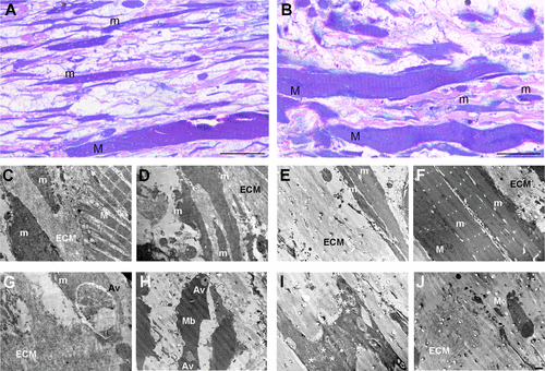 Histology and ultrastructure of the injury area in ankrd1a mutant and wild-type (wt) skeletal muscle at 5 days postinjury (dpi). Representative light microscopy (LM) images of ankrd1a+/+ (A) and ankrd1a−/− (B) skeletal muscle (n = 4). Muscle fibers are blue, collagen is pink. C–F: representative transmission electron microscopy (TEM) images of ankrd1a+/+ (C and D) and ankrd1a−/− (E and F) skeletal muscle. G–I: autophagic vesicles observed in ankrd1a+/+ (G) and ankrd1a−/− (H and I) skeletal muscle. J: macrophage detected in ankrd1a−/− skeletal muscle. Av and *, autophagy vesicle; ECM, extracellular matrix; M, myofiber; m, newly growing myofiber; Mb, myoblast; Mφ, macrophage. Scale bars, 20 µm for A and B and 1 µm for C and J. |
