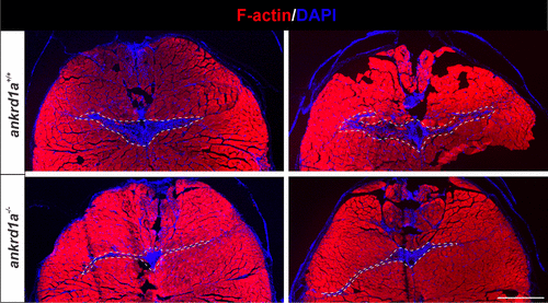 Representative examples of wounded skeletal muscle tissue in wild-type (wt) and ankrd1a mutant zebrafish at 7 days postinjury (dpi). Injury is recognized as an area without phalloidin-stained myofibers (red) and with nuclei accumulation (blue). Imaging was performed on sections of ankrd1a−/− and ankrd1a+/+ zebrafish (n = 4), which were age-matched and injured at the same time. White dashed lines delineate the remaining injured muscle tissue. Scale bar, 400 µm. |