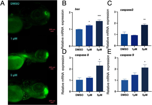 Vitamin A improves neurodevelopment and the relative expression of dopamine-related genes. DMSO was used as the control group in this experiment. The 1 μM group represented the exposure group with a PFOS concentration of 1 μM, and the 5 μM group represented the exposure group with a PFOS concentration of 5 μM. “VA” refers to the vitamin A group; 1 μM + VA denotes the vitamin A intervention group with a PFOS concentration of 1 μM, and 5 μM + VA denotes the vitamin A intervention group with a PFOS concentration of 5 μM. |
