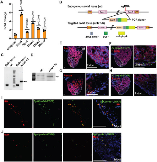 Dynamic expression of Nr4a1 after cardiac injury. (A) Expression pattern of nr4a1 at different stages post-injury. The fold change is calculated relative to the expression in uninjured wild-type (wt) hearts. (B) The schematic for generating TgKI(nr4a1:eGFP). (C) Detection of nr4a1:eGFP fusion mRNA. The 518 bp band indicates correct nr4a1:eGFP fusion cDNA. (D) Western blot analysis of TgKI(nr4a1:eGFP) to identify the fusion Nr4a1:eGPF protein (88kD). (E-H) Expression of Nr4a1, as revealed by GFP antibody staining, in 2 and 7 dpci hearts. (I) IB4 staining to localize Nr4a1 expression in macrophages within 7 dpci hearts. (J) Anti-Mpx antibody staining to localize Nr4a1 expression in neutrophils within 2 dpci hearts. P-values<0.05 were considered statistically significant (two-tailed unpaired t-test). Scale bars: 60 µm.