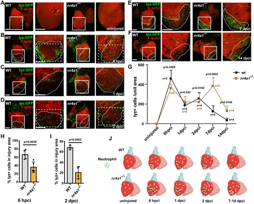 Defective neutrophil migration in nr4a1 mutant. (A-F) Left: distribution of neutrophils in uninjured wild-type (WT) hearts and WT hearts at 6 hpci and 1, 2,7, and 14 dpci. Right: distribution of neutrophils in uninjured nr4a1 mutant hearts and nr4a1 mutant hearts at 6 hpci and 1, 2,7, and 14 dpci. Boxed regions show the approximate positions for cell number quantification, and position of magnified images. Dashed box regions show the approximate positions of neutrophils around the wounded area. (G) Temporal dynamics of neutrophil number across multiple time points. Individual sample numbers (n) are indicated on the plot. (H,I) Percentage of neutrophil numbers in the wounded area per unit square area. (J) Schematic depicting the temporal dynamics of neutrophil number during heart regeneration. Created in BioRender by Feng, D., 2025. https://BioRender.com/vyhyvzk. This figure was sublicensed under CC-BY 4.0 terms. P-values<0.05 were considered statistically significant (two-tailed unpaired t-test, G). Data are mean±s.e.m. Scale bars: 275 µm.