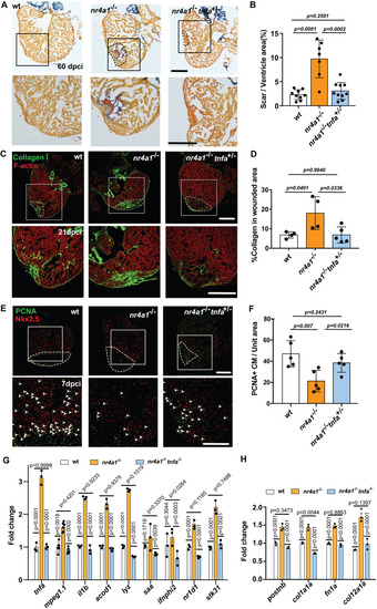Partial restoration of cardiac regeneration in nr4a1 mutant through reduction of inflammatory response. (A) AFOG staining performed on cardiac sections of the indicated genotypes at 60 dpci. (B) Quantification of scar size in AFOG-stained cardiac sections. (C) Collagen deposition in the hearts of indicated genotypes at 21 dpci, as detected by staining with collagen I antibody. (D) Quantification of collagen deposition in the wounded area at 21 dpci. (E) PCNA/Nkx2.5 double immunostaining to detect proliferating cardiomyocytes in 7 dpci hearts of indicated genotypes. Arrowheads indicate the proliferating cardiomyocytes. (F) Quantification of colocalization of PCNA and Nkx2.5 per unit area in different groups. (G) qPCR of inflammation-related genes in the hearts of indicated genotypes at 7 dpci. (H) qPCR of fibrosis-related genes in the hearts of indicated genotypes at 7 dpci. Dashed lines show the wounded area. Boxed regions in A and E show the position of magnified images at the bottom. Boxed regions in C show the approximate positions for quantification. The fold changes in G and H are calculated relative to the expression in uninjured WT hearts. P-values<0.05 were considered to be statistically significant (two-tailed unpaired t-test in B, D and F; two-way ANOVA with Sidak test for multiple comparison correction and two-tailed unpaired t-test in G and H). Data are mean±s.e.m. Scale bars: 275 µm (A,E); 250 µm (C).