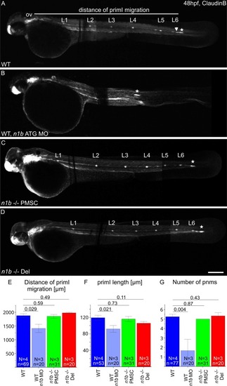 ncam1b knockdown and knockout leads to different phenotypes in the development of the lateral line system. (A–D) Lateral views of 48 hpf Tg(ClaudinB::lynGFP) (A) Wild type (WT) (B) n1b morphant, (C) n1b -/- PMSC and (D) n1b -/- Del. Embryos are oriented with rostral to the left and dorsal to the top. (A) At 48 hpf, primI (star) of WT reaches the tip of the tail and deposits 6 proneuromasts (L1-L6), with the last one having just been deposited (arrow). The migration distance was measured from the otic vesicle (ov) to primI. (B) ncam1b morpholino injection leads to reduced migration of a smaller primI and deposition of fewer proneuromasts. (C + D) n1b -/- PMSC and n1b -/- Del mutants phenocopy the WT phenotype, with primI reaching the tip of the tail at 48 hpt and depositing 6 proneuromasts (L1-L6). (E–G) Quantification of migration distance, primI length and number of proneuromasts in WT, ncam1b morpholino injected embryos, n1b -/- PMSC and n1b -/- Del. Bars indicate mean values of the medians of each experiment, with error bars representing standard error. Statistic was made using two-sided t-test. Scale bar 200 µm. Abbreviations: WT: Wild type; n1b -/- PMSC: ncam1b -/- Premature Stop Codon mutant; n1b -/- Del: ncam1b deletion mutant; MO: Morpholino; primI: primordium; pnm: proneuromast; ov: otic vesicle. |