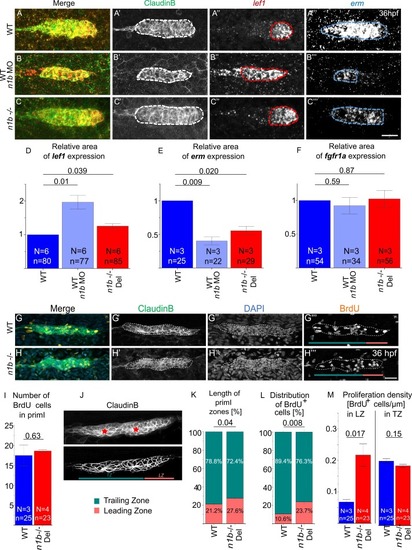 Loss of ncam1b leads to small differences in signaling and proliferation within the migrating primordium. (A-C) Fluorescence in situ hybridization of 36 hpf Tg(ClaudinB::lynGFP) primordia in (A) WT, (B) ncam1b morphants, and (C) n1b -/- Del. Areas for expression analysis were delineated in Fiji by drawing around regions that displayed a strong signal compared to the background, while regions with only weak or faint signals were excluded. Red outline indicates lef1 expression area, blue outline indicates erm expression area. (D–F) Quantification of regions expressing (D) lef1, (E) fgfr1a (microscopy images shown in Supp. 3), and (F) erm. ncam1b absence leads to an enlarged lef1 region and a reduced erm region, fgfr1a expression domain is unaffected. (G–M) BrdU staining reveals changes in proliferating cell distribution. (G-H) WT and ncam1b mutant Tg(ClaudinB::lynGFP) embryos were treated with BrdU at 36 hpf for 20 min and immunostained for BrdU (orange), GFP (green) and DAPI (blue) as indicated. Color bars in (G''' + H''') indicate the respective zones in turquoise for the Trailing Zone and reddish for the Leading Zone. (I) Numbers of BrdU-positive cells in WT and n1b -/- Del primordia. (J) Illustration of the subdivision of primI into Leading (LZ) and Trailing Zones (TZ) based on cell morphology. The upper panel shows the original image, while in the lower panel the contrast was enhanced to better visualize morphological differences between the TZ and LZ. Cells in the TZ are organized into rosette-like proneuromasts (epithelial character). They are arranged radially around a central prospective first hair cell (asterisk). The cells in the LZ display a more randomly oriented, mesenchymal-like morphology. (K) Changes in the length of Leading and Trailing Zone in ncam1b mutants compared to the wild type. (L) Redistribution of proliferating cells within Leading and Trailing Zones. (M) Proliferation density, as calculated by dividing the number of BrdU+ cell by the zone length, is significantly higher in the Leading Zone of ncam1b mutants compared to wild type. Bars indicate mean values of the medians of each experiment, with error bars representing standard error. Statistical test for (D–F, I, M): Two-sided t-test and for (K+L): χ2-test. Scale bars 20 µm. Abbreviations: WT: Wild type; n1b -/- Del: ncam1b deletion mutant; MO: Morpholino; primI: primordium; TZ: Trailing Zone; LZ: Leading Zone. |