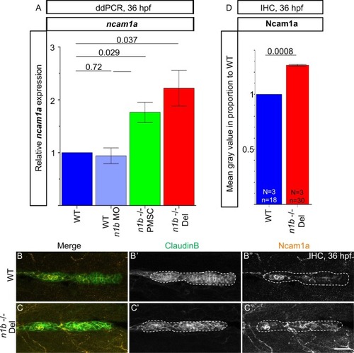 Upregulation of ncam1a in ncam1b mutant embryos. (A) ddPCR measurements normalized to the housekeeping gene β-actin show significant upregulation of ncam1a and in ncam1b mutants, but not in ncam1b morphants, at 36 hpf. Mean gene expression levels were determined using biological triplicates or quadruplicates, each representing the mean of technical duplicates. Wild type (WT), n1b -/- PMSC mutants, and n1b -/- Del mutants were analyzed, with pools of 100 embryos per condition. (B–D) Ncam1a expression (orange) in the migrating primordium (primI). (B) Tg(ClaudinB::lynGFP), serving as wild type, and (C) ncam1b -/- Del; Tg(ClaudinB::lynGFP). (B’ + C’) Utilizing ClaudinB::lynGFP expression, a threshold was set to delineate the outline of primI (white border), Ncam1a expression in this region (B’’ + C’’) was quantified by mean grey value measurement of using Fiji. (D) The mean grey value of the n1b -/- Del mutant normalized to the WT shows a significant upregulation of Ncam1a expression. Statistic was made using one sample t-test. Scale bar 20 µm. Abbreviations: WT: Wild type; n1b -/- PMSC: ncam1b -/- Premature Stop Codon mutant; n1b -/- Del: ncam1b deletion mutant; IHC: Immunohistochemistry. |