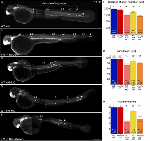 Knockdown of ncam1a in ncam1b mutants phenocopies the ncam1b knockdown phenotype. (A–E) Lateral views of 48 hpf Tg(ClaudinB::lynGFP) (A) Wild type uninjected (WT uni) (B) n1b -/- Del uninjected, (C) n1b MO in WT, (D) ncam1a MO in WT and (E) ncam1a MO in n1b -/- Del. Embryos are oriented with rostral to the left and dorsal to the top. (A) At 48 hpf, primI (star) of WT reaches the tip of the tail and deposits 5 proneuromasts (L1–L5). The migration distance was measured from the otic vesicle (ov) to primI. (B) n1b -/- Del mutants show the same phenotype as WT, with primI reaching the tip of the tail and 5 deposited proneuromasts. (C) ncam1b MO injection leads to reduced migration of smaller primI and deposition of fewer proneuromasts. (D) Injection of the ncam1a MO in wild type zebrafish caused moderate defects in lateral line system development, but these effects did not reach statistical significance. (E) ncam1a MO injection in n1b -/- Del induce reduced migration of a smaller primI and fewer deposited neuromasts. (F-H) Quantification of migration distance, primI length and number of proneuromasts. Bars indicate mean values of the medians of each experiment, with error bars representing standard error. Differences between the five groups were analyzed using a one-way ANOVA followed by Scheffé post hoc tests. Differences were considered significant if the F-value exceeded the critical Scheffé value (p < 0.05). Groups that share the same letter do not differ significantly. Groups with different letters show significant differences in their means. Scale bar 200 µm. Abbreviations: WT: Wild type; n1b -/- Del: ncam1b deletion mutant; MO: Morpholino; uni: uninjected; primI: primordium; pnm: proneuromast; ov: otic vesicle. |