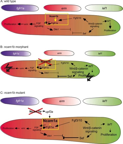 Model of signaling in the migrating primordium in WT, ncam1b morphant, and ncam1b mutant. Rostral is left, caudal is right. Small primordia depict fgfr1a (purple), erm (red), and lef1 (green) expression distributions, respectively. The large primordia represent overall complex signaling. erm (red) and lef1 (green) expression regions are color-coded. The yellow box highlights the interaction of Ncam1b or Ncam1a with Fgfr1a. Black flashes indicate severely disrupted proliferation. |