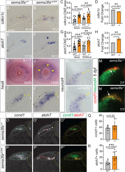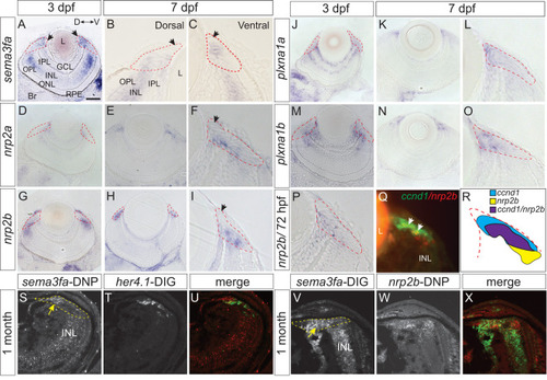 Expression of mRNAs for Sema3fa and its receptors in the larval and juvenile CMZ. Plastic sections through the eyes of WM ISH of 3 (A, D, G, J, M, P) and 7 (B, C, E, F, H, I, K, L, N, O) dpf larvae for |