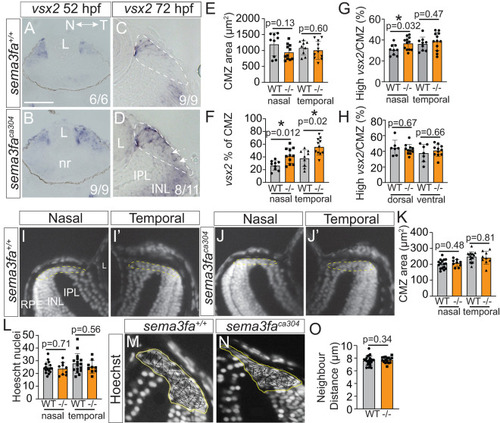 Disrupted organization of committed CMZ progenitors in the absence of Sema3fa. WM ISH for Zone 3 markers shown in 7 µm plastic sections (A, B, E, F, I′, J′, K, L), z-stack of confocal optical sections |