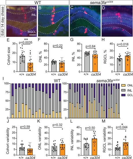 Altered size and cell composition of CMZ-derived radial cohorts with loss of Sema3fa. EdU labelling of retinas of 20 dpf zebrafish larvae incubated for 4 hrs with EdU at 5 dpf. |