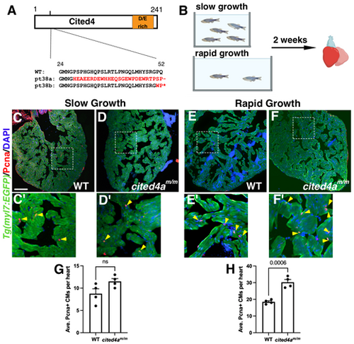 Increased CM proliferation is observed in cited4am/m under rapid growth conditions. (A) Schematic of Cited4a protein with glutamic and aspartic acid (D/E)-rich domain and predicted amino acid sequence of cited4a alleles. Altered sequence in red. (B) Schematic of slow versus rapid growth experiment in juvenile zebrafish. Created in BioRender by Tsang, M. (2025). https://BioRender.com/0lu862o. This figure was sublicensed under CC-BY 4.0 terms. (C-F′) Pcna immunostaining (red) of Tg(myl7:EGF) (WT) and mutant [Tg(myl7:EGFP);cited4am/m] hearts from slow and rapid growth conditions to mark proliferating cells. Magnification of dashed boxed areas below show regions of the ventricle with proliferating CMs. Arrowheads indicate PCNA-positive CMs. (G) Graph of average Pcna+ CMs per heart (n=4 for each condition) from slow growth. (H) Graph of Pcna+ CMs from rapid growth. Data are mean±s.e.m. Unpaired two-tailed t-test. ns, not significant. Scale bar: 100 µm. |